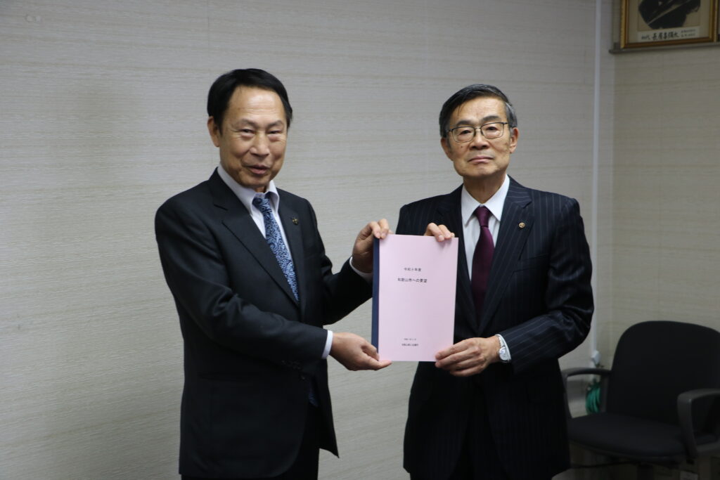要望書には、全部会共通として「生産者物価高騰や人件費の上昇に伴うコスト負担増と人手不足への対応支援」、「和歌山商工会議所新庁舎の早期実現に向けた支援」、「観光客の増加を見据えたJR和歌山駅周辺の再開発」に関する項目と、各部会・女性会において意見集約した「人手不足対策」「地場産業振興策」「観光振興策」「防災対策」など35項目を盛り込み、尾花市長に要望しました。