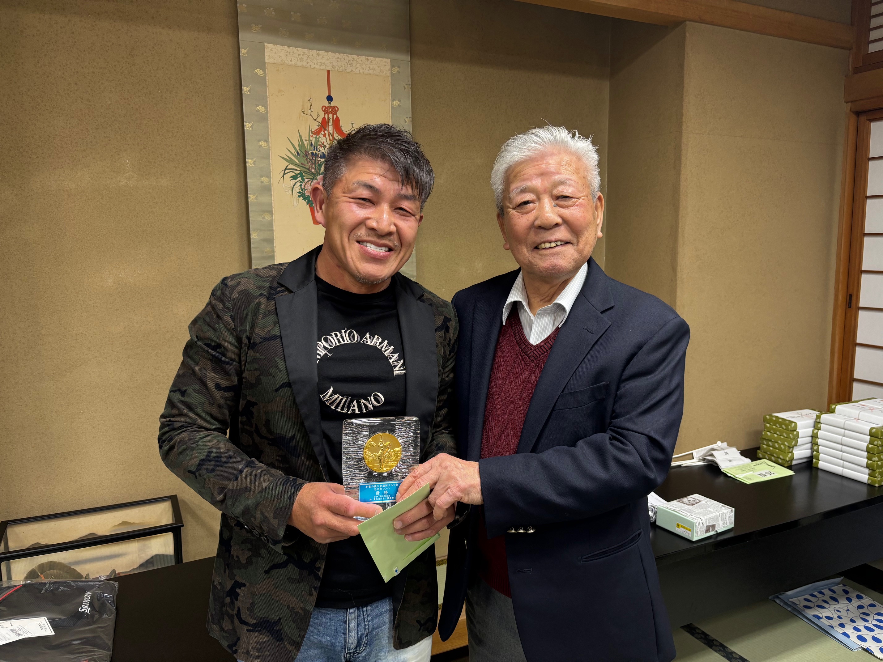 2025.12.05 活動報告 (2025.12.03)【ゴルフ会】忘年杯コンペ 貴志川ゴルフ倶楽部において、ゴルフ会忘年杯コンペを開催しました。 当日は49名が参加し、プレーを楽しみました。 ●成績は以下の通り 優勝 仲村 勝頼 氏 (株)仲村工業 (グロス92 ハンディ17.8 ネット74.2) 2位 今西 謙治 氏 和歌山商工会議所ゴルフ会顧問 3位 キム スクヒ 氏 ハヤシ <優勝した仲村氏(左)と新家会長>