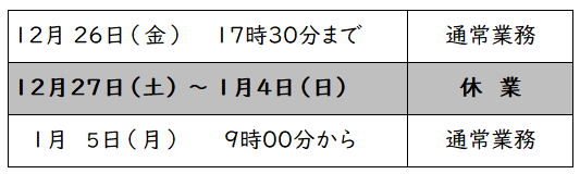 2025.12.08 お知らせ 年末年始の業務に関するお知らせ 年末年始の業務は、下記のとおりです。 ■年末年始の業務日程 【お問い合わせ】和歌山商工会議所 総務・広報課 (TEL:073-422-1111)